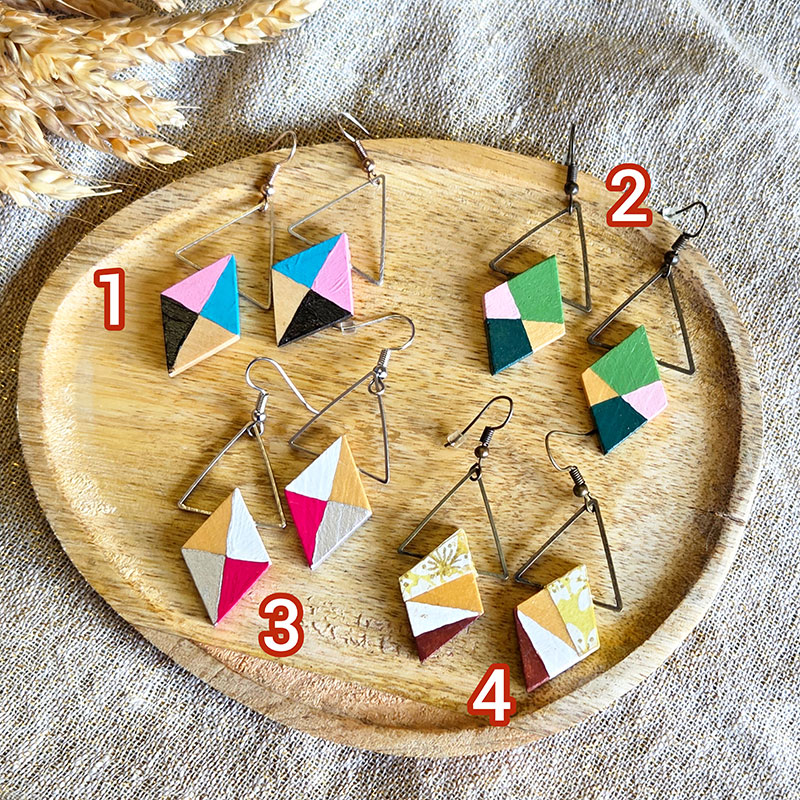 Le tilleul constitue aussi un excellent support pour les finitions décoratives. Sa surface lisse permet d’appliquer facilement des peintures, des pigments ou des feuilles métalliques qui viennent souligner les formes du bijou. Les boucles d’oreilles géométriques réalisées dans ce bois peuvent ainsi se décliner dans une grande variété de couleurs et de styles, du bijou symbolique et extravagant aux puces minimalistes et discrètes, tout en conservant la finesse et la légèreté propres à cette essence.