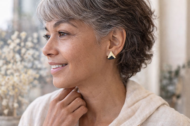Nous avons imaginé ces boucles d’oreilles clous comme une ode à toutes les féminités, et quel symbole plus juste et universel que le triangle ? Depuis les mythes anciens et les traditions spirituelles, le triangle est intimement lié au corps de la femme, à la fécondité et à l’énergie vitale. Sa forme évoque à la fois le principe créateur, la sensibilité et la force intérieure, cette puissance douce qui traverse les cycles de la vie.