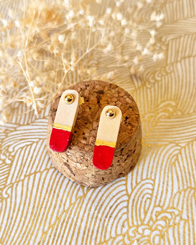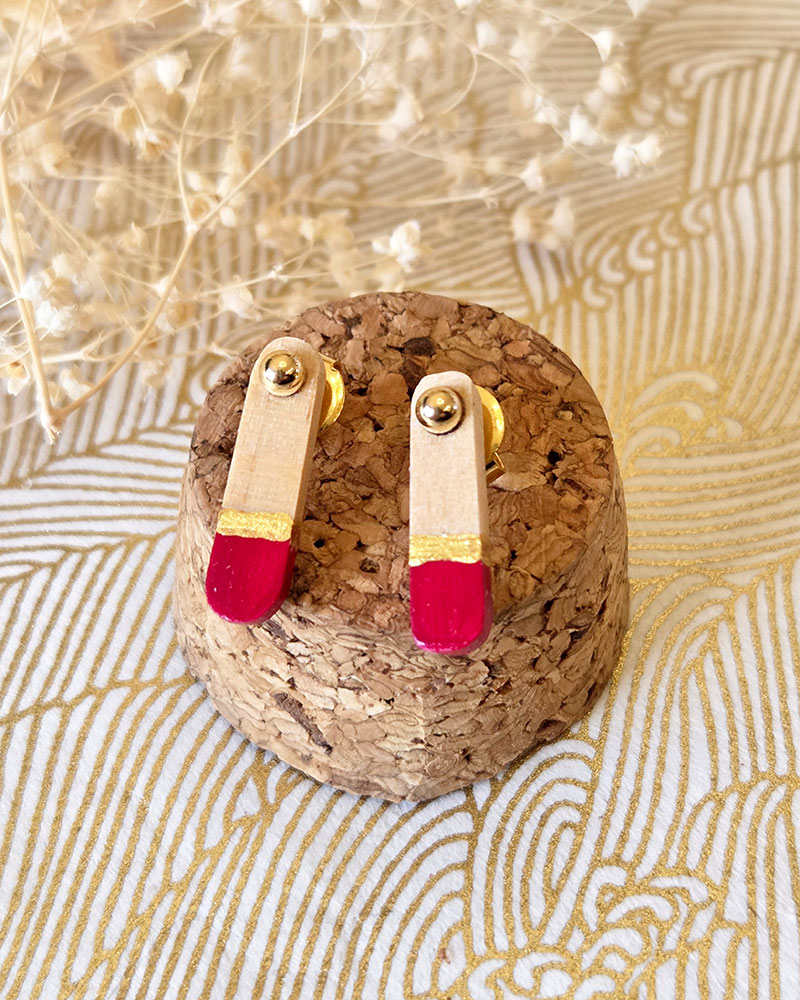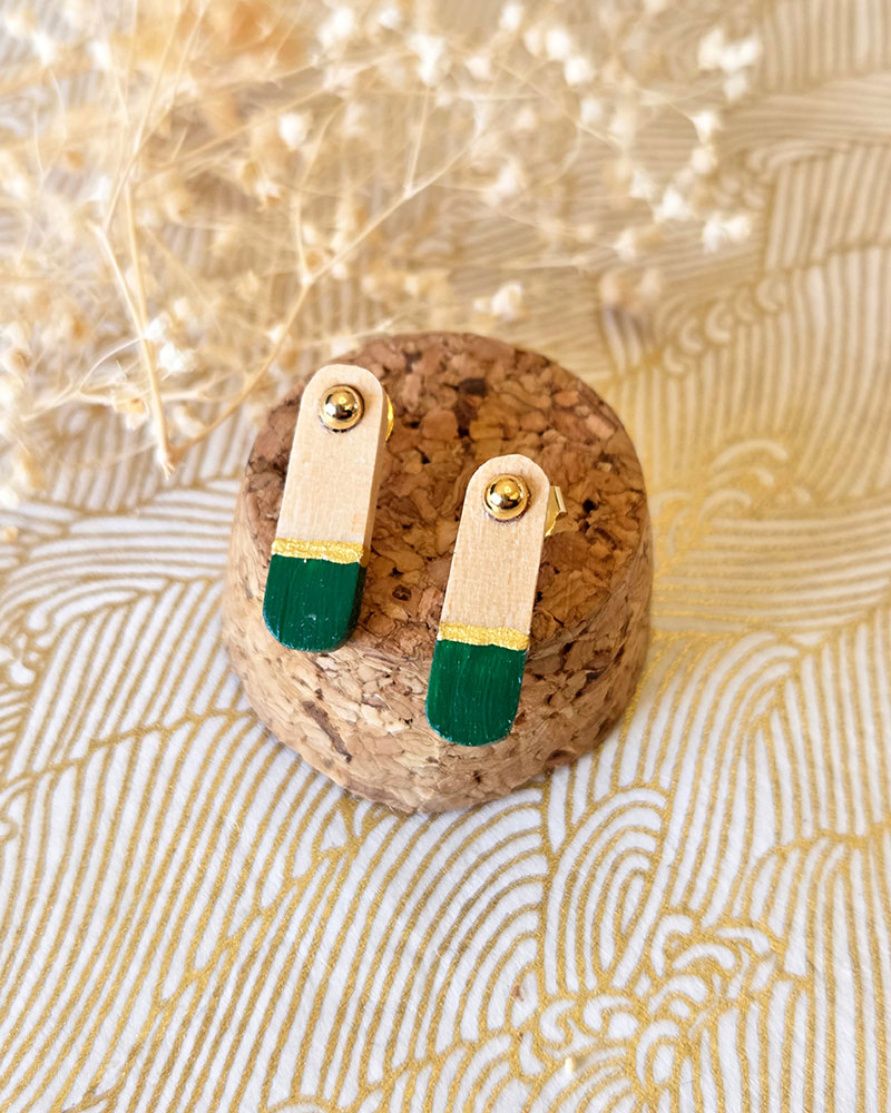 Choisir des clous d’oreilles originaux, c’est ainsi associer confort, praticité et esthétique, tout en valorisant un travail artisanal précis du bois minutieusement découpé et peint à la main. Un bijou conçu pour durer et attirer le regard avec subtilité. La plupart de nos créations peuvent d’ailleurs être adaptées en version clou, comme c’est le cas pour nos boucles d’oreilles origami.